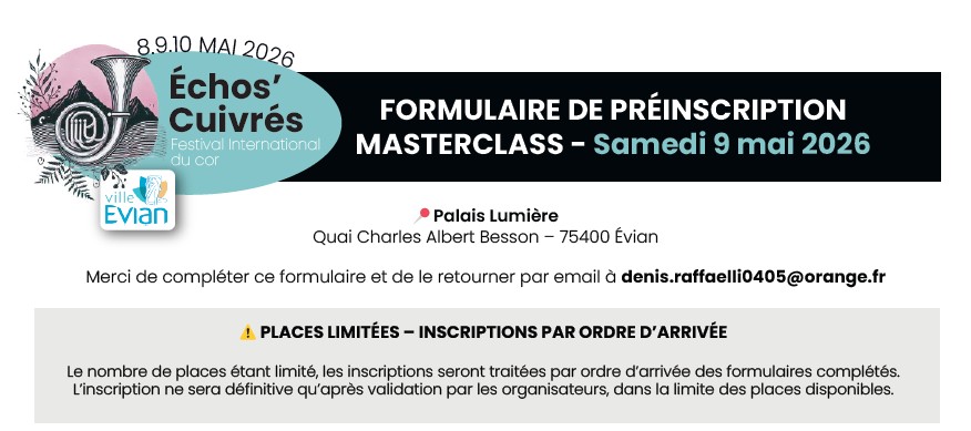 8 9 10 MAI 2026 – Évian Cliquez sur l’image pour télécharger MASTERCLASS de Cor Moderne 50,00 € Contenus afficher 1 8 9 10 MAI 2026 – Évian 1.1 MASTERCLASS de Cor Moderne